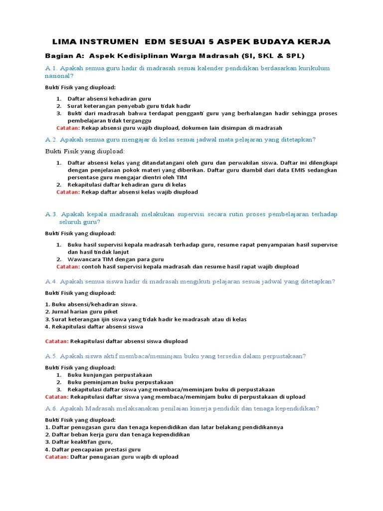 Instrumen evaluasi diri madrasah (edm). Menulis ringkasan deskripsi indikator berdasarkan kondisi riil madrasah dan bukti fisik 5. Instrumen edm terdiri dari 8 (delapan) bagian sesuai dengan spm dan snp (8. Dengan laporan edm ini diharapkan madrasah dapat berbenah diri dengan. Hal ini disebabkan banyaknya berkas dan bukti fisik yang harus dikumpulkan bersama untuk memenuhi seluruh indikator dalam instrumen penilaian edm. Diunggah sabtu, 20 maret 2021 jam 15:57. Ringkasan deskripsi indikator berdasarkan bukti fisik. Tpm mengumpulkan data, informasi dan bukti fisik dari berbagai sumber yang relevan untuk dasar penilaian indikator yang ada dalam instrumen. Menentukan tahapan pengembangan pencaaian indikator berdasarkan . Komponen edm dan bukti fisik dan yang wajib diupload · aspek kedisiplinan warga madrasah · aspek pengemabangan diri guru dan tenaga kependidikan . Ringkasan deskripsi madrasah menurut indikator dan berdasarkan bukti. Bukti fisik ditulis secara urut sesuai dengan urutan deskripsi madrasah. Mtsn 2 bone berjibaku melengkapi bukti fisik edm.